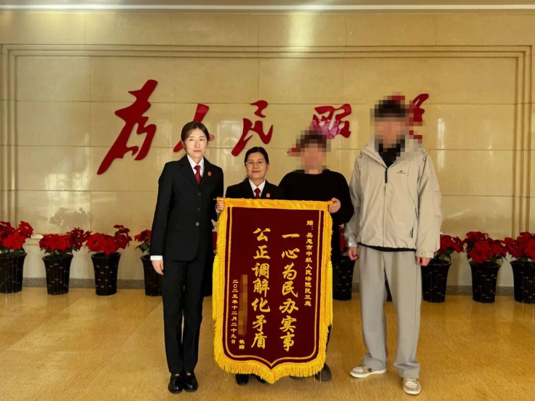 在吴忠中院的法庭上,用人单位与赵某某全体近亲属共同签署了调解协议。协议不仅确认了劳动关系,明确了赔偿数额,更将家庭内部分配方案予以固定。公司方当庭通过银行转账,将88万元赔偿款全额支付完毕。签字笔落下,调解书生效,款项到账的提示音接连响起。法庭里,赵某某妻子拉住办案法官的手几度哽咽……拿到调解书后,双方联名向吴忠中院赠送了锦旗。