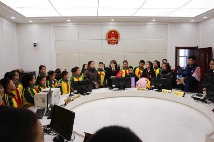 津津乐道,传承法治文化。 “这个房间的墙怎么是软的”“少年法庭跟其他的法庭不太一样”“原来一个‘法’字还经历了这么多次的演变”……法院开放日活动中,来自市第二十一小学的学生们带着好奇与期待,依次走进文化长廊、法庭、羁押室、诉讼服务中心、安检大厅等区域,互动式了解“法”的由来、少年法庭的“平等”圆桌、家事法庭的“温馨”陈设、羁押室的“贴心”软包、安检大厅的“硬核”守护等,“零距离”感受法治文化,在心中种下法治“种子”。